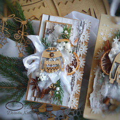 It's still a long way to Christmas, but it's worth preparing some things in advance. This year I have already made my first Christmas card and a decorative bag to go with it. Both are decorated in natural colors of white, brown and green. I decorated them with cute sweaters, bells and hats from the hdf Winter Wonderland collection. I also stamped the stardust template on the bag. White splashes, balls, lace, wadding, fur and green twigs gave a truly winter atmosphere. Moreover, the set smells wonderfully of anise and cinnamon...