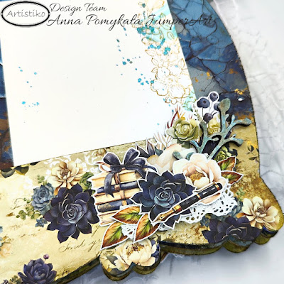 For my first inspiration for Artistiko, I chose to create an album using a ready-made base. I selected an HDF frame as the base, painting its cover with white gesso and splattering diluted watercolors. Gold, along with mists and powders with a shimmer effect, added uniqueness. I used the same media for the text and HDF branches incorporated into the compositions on the album pages. Grandparents will have a special gift from their grandchildren. Just need to attach the photos.