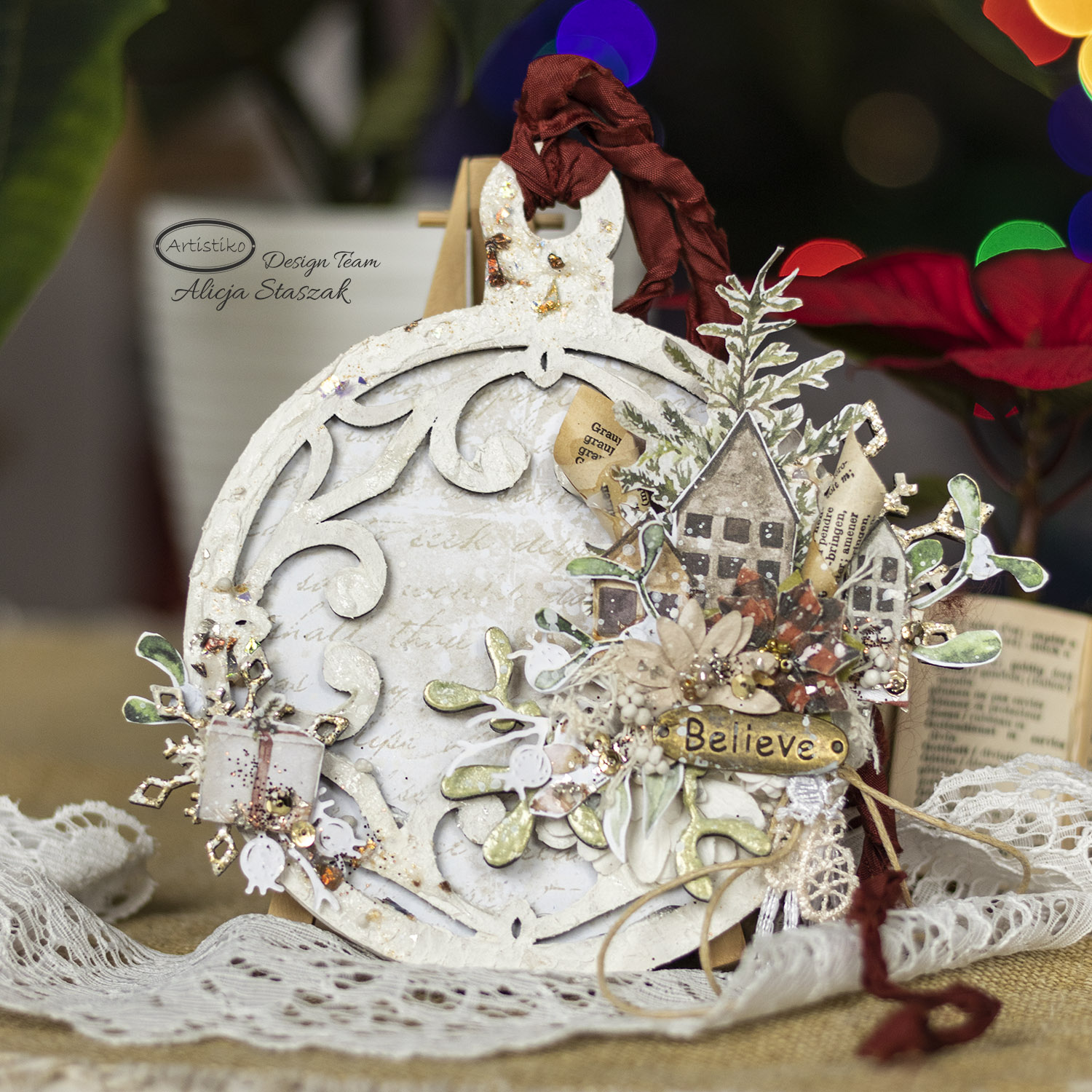Dziś chcę wam pokazać ostatnią dekorację, którą przygotowałam w tym roku. Jako bazę wybrałam średnią bombkę z ornamentem. Dodałam tło z papieru, a ażurowy element pomalowałam białym gesso, pastą śniegową oraz lodową. Po wyschnięciu ułożyłam kompozycję z choinką i kwiatami. Przygotowałam również video, które pokazuje proces tworzenia.